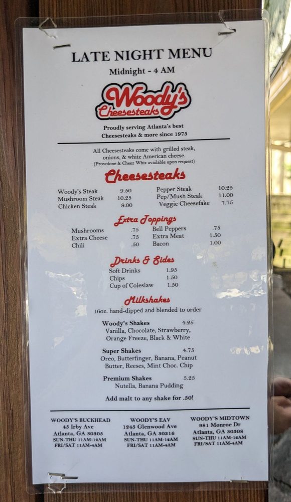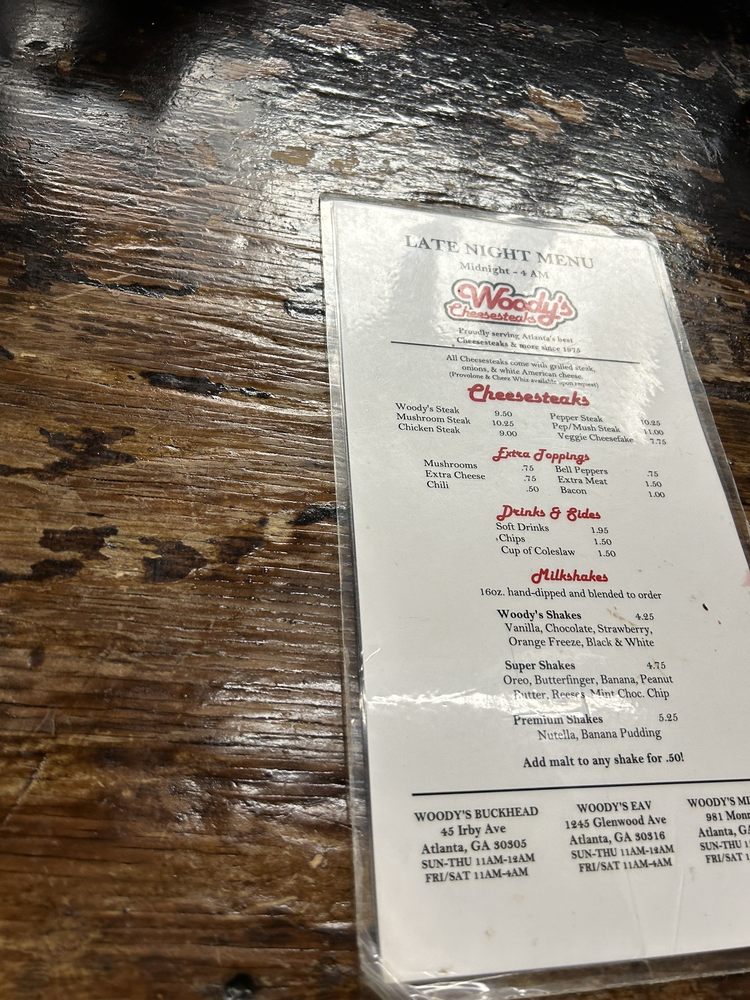 Woody's CheeseSteaks is a popular spot in Atlanta known for its flavorful and massive cheesesteaks. With options like the cheese whiz cheesesteak and classic cheesesteak, customers can customize their orders to satisfy their cravings. Despite a small sitting area inside, the outdoor deck offers a nice dining option. The fast service makes it a great choice for a quick lunch or dinner. Customers appreciate the well-seasoned and full-flavored cheesesteaks, highlighting the quality of the meat and the tasty rolls. The menu also includes other sandwiches like the turkey sub, all at extremely affordable prices. Although the ambiance may not be the most inviting, the delicious food makes Woody's a must-visit for cheesesteak lovers. Enjoy a satisfying meal at Woody's CheeseSteaks and indulge in their savory offerings.